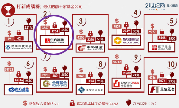 2012年,21世纪网对全部公募基金公司打新能力进行了数据分析和评价,东方基金获配资金达3557万元,浮盈比率达到55%